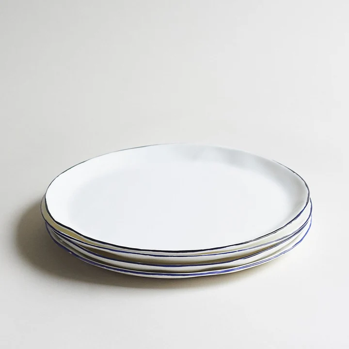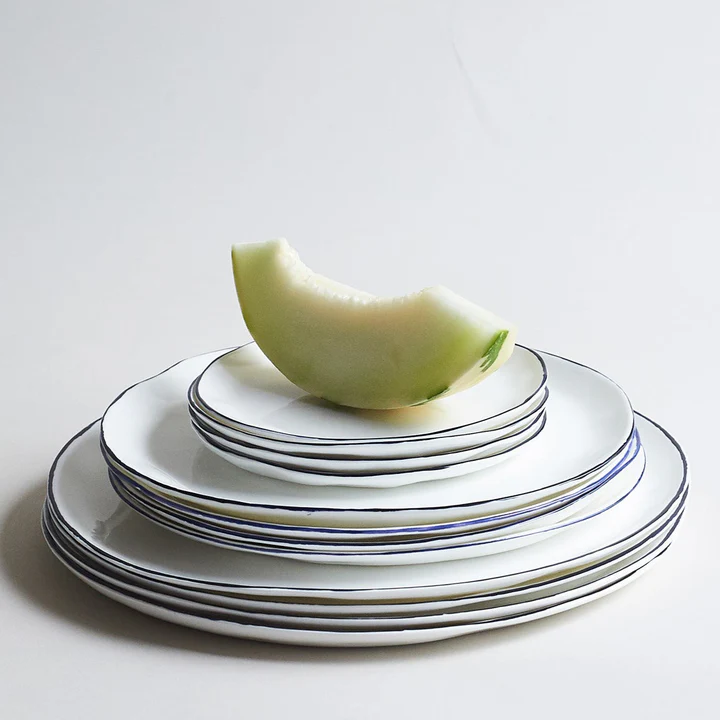 Feldspar's collection of plates and bowls are designed to sit together or alone - each with a shallow dimpled lip and a sketch-like hand painted banding in cobalt blue to contrast with the bright white of the fine bone china. All handmade in Stoke-on-Trent.