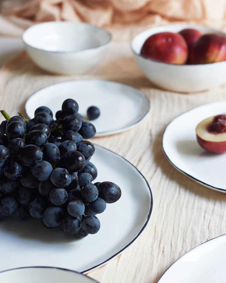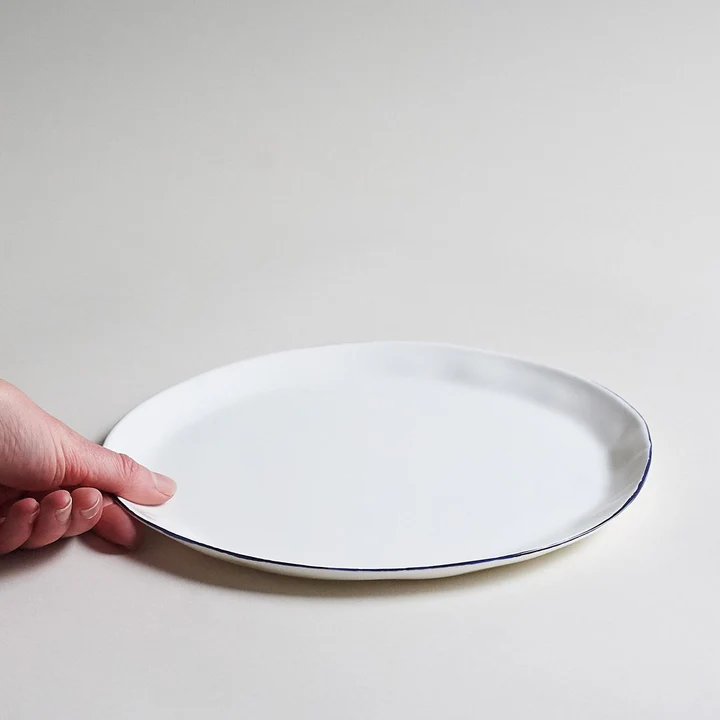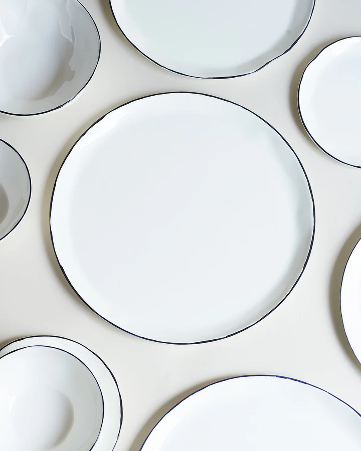 The middle-sized plate, Feldspar's side plate has a dimpled lip to catch wandering dressings and hand-painted deep cobalt blue banding, creating modern elegant place settings. You can also find sets of four Side Plate here.